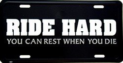 Smart Blonde is one of the largest factory-direct distributors of novelty aluminum signs and license plates in the U.S. and we are manufacturers too. Every item we carry is of the utmost highest quality aluminum metal because we believe it absolutely matters! We have compared plastic and the super heavy weight steel (3 lbs each) signs and license plates, as well as the very ultra thin lightweight aluminum embossed and non-embossed signs. Our conclusion was simple: Plastic was really just ok, steel was way too heavy to ship and stock and the ultra lightweight aluminum... well they just bend like a piece of paper. Ride Hard, Rest when You Die License Plates Size: 6 x 12